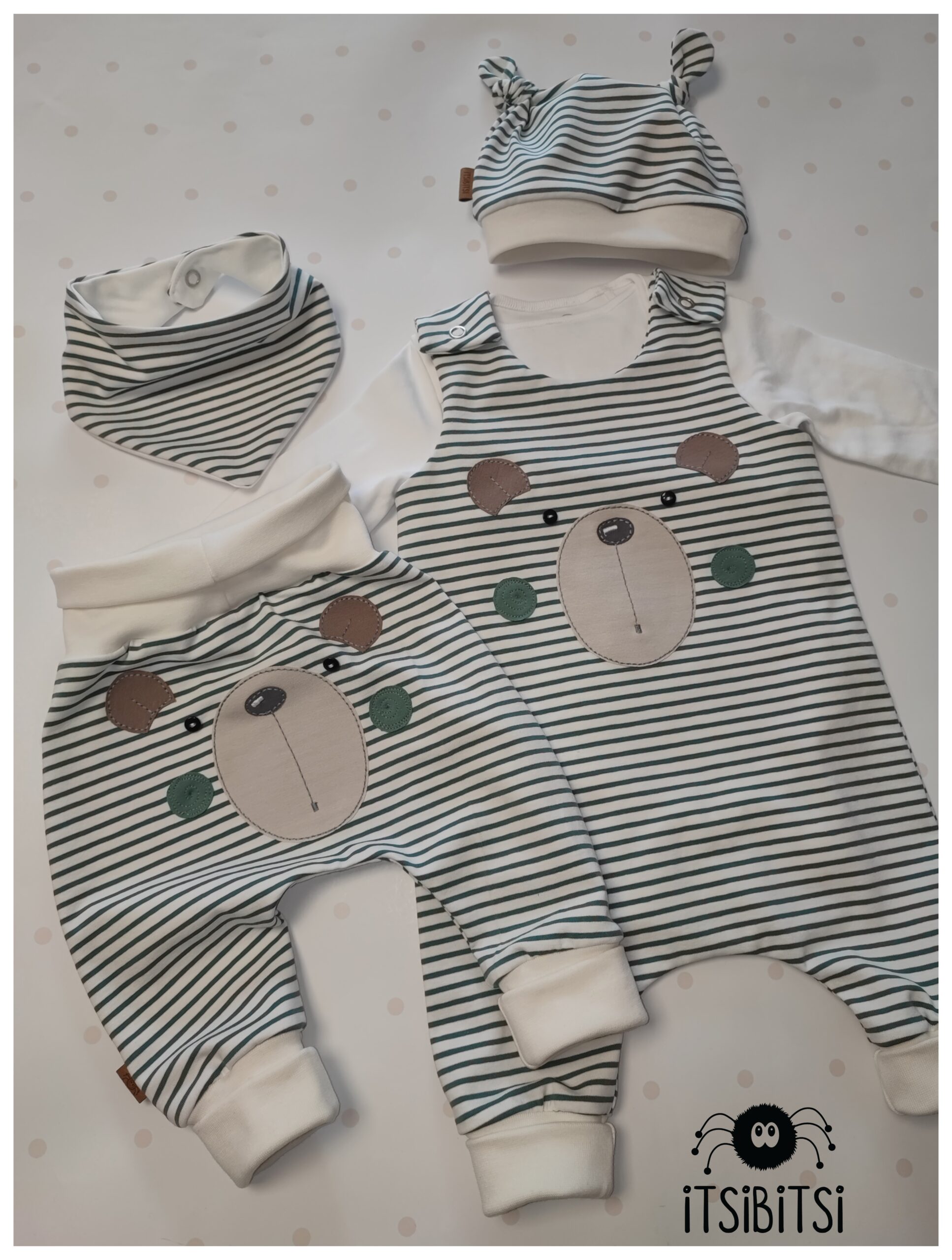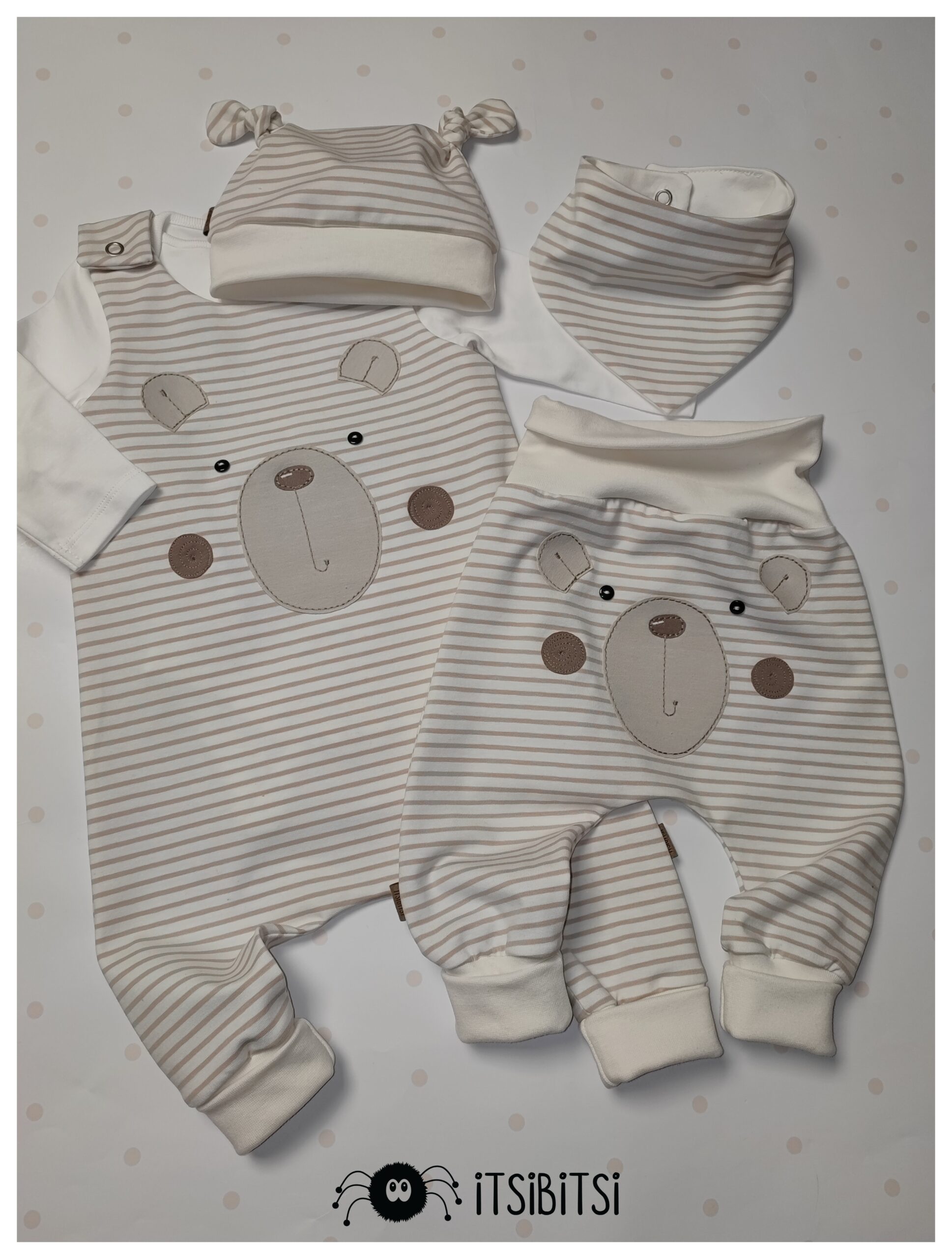 V kompletu je romper z aplikacijo medvedka, hlače z aplikacijo medvedka na ritki, kapica in rutka.